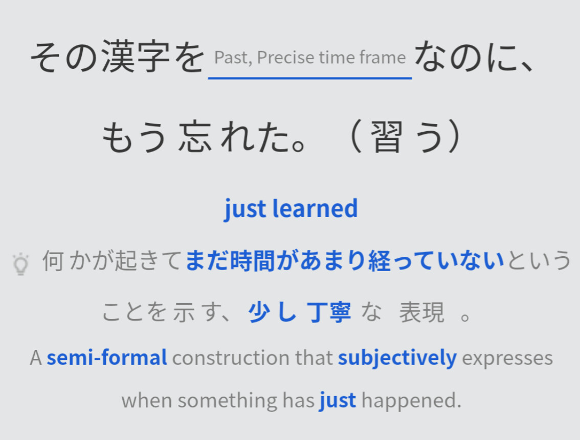This corresponds with the grammar item ~たばかり, but the word subjectively is not present in the lesson anywhere. And it’s not just about that specific word. The entire concept is simply NOT in the lesson.