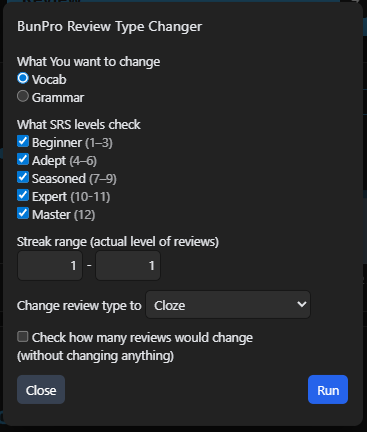 I created it because currently I’m setting new reviews as Cloze, but after reaching Adept 2 I want to change them to Reading, but doing so by hand takes too much time >_<