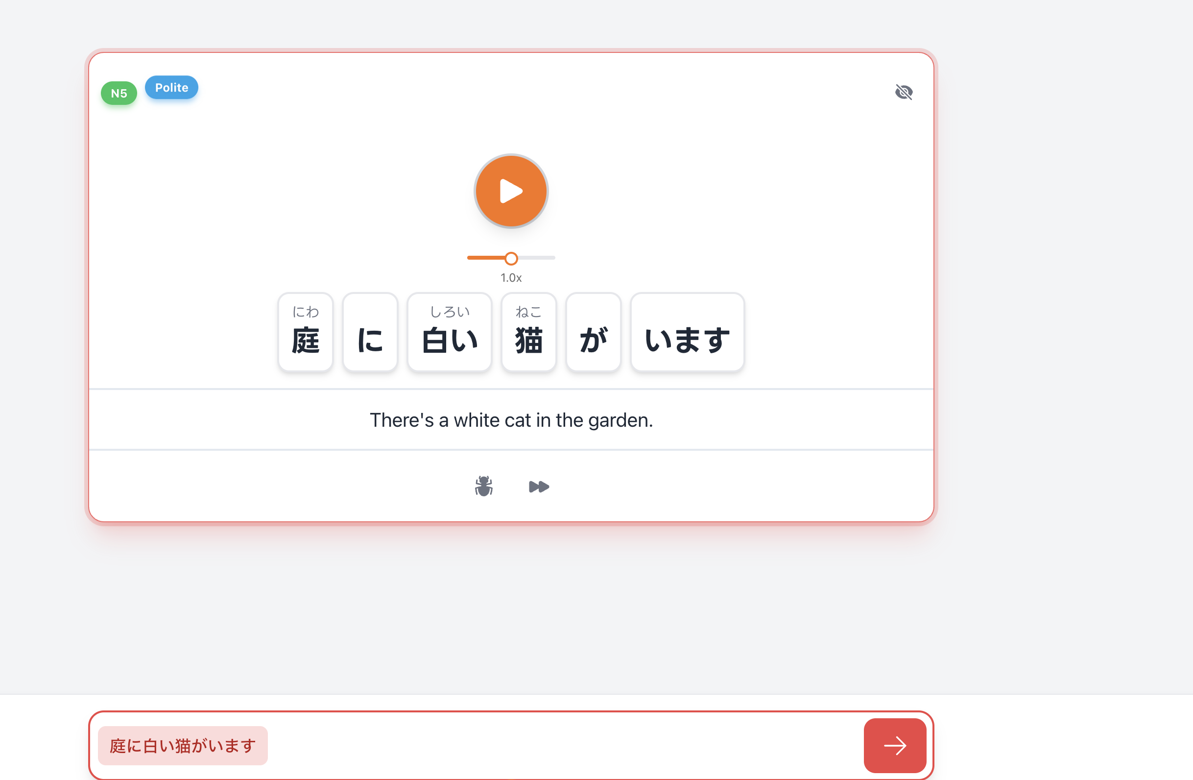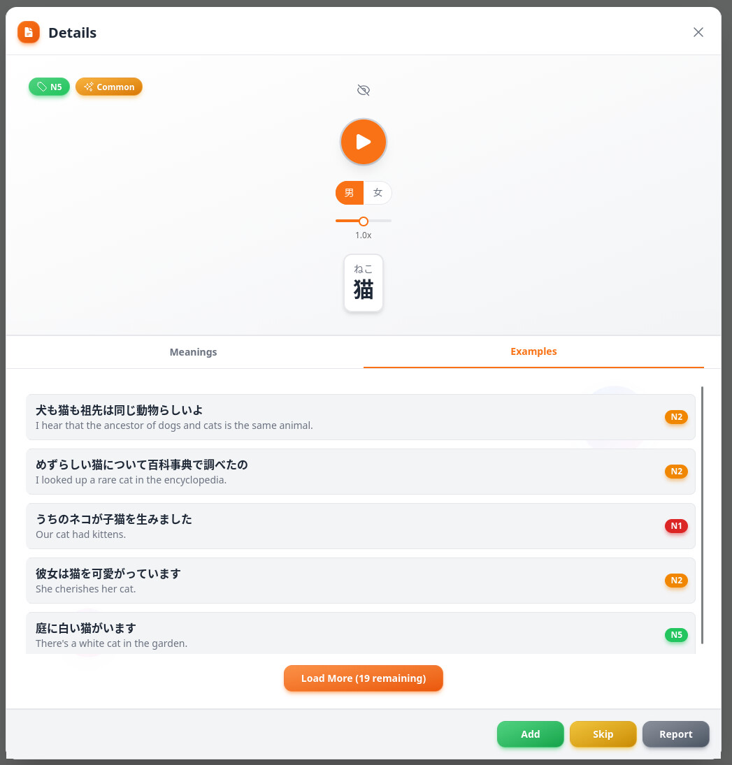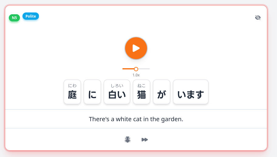 The concept is simple: You hear a sentence and type what you hear. The main difference from other apps? If you mishear a specific word, you can add that individual word to your SRS and learn it separately until you can recognize it back in the full sentence.