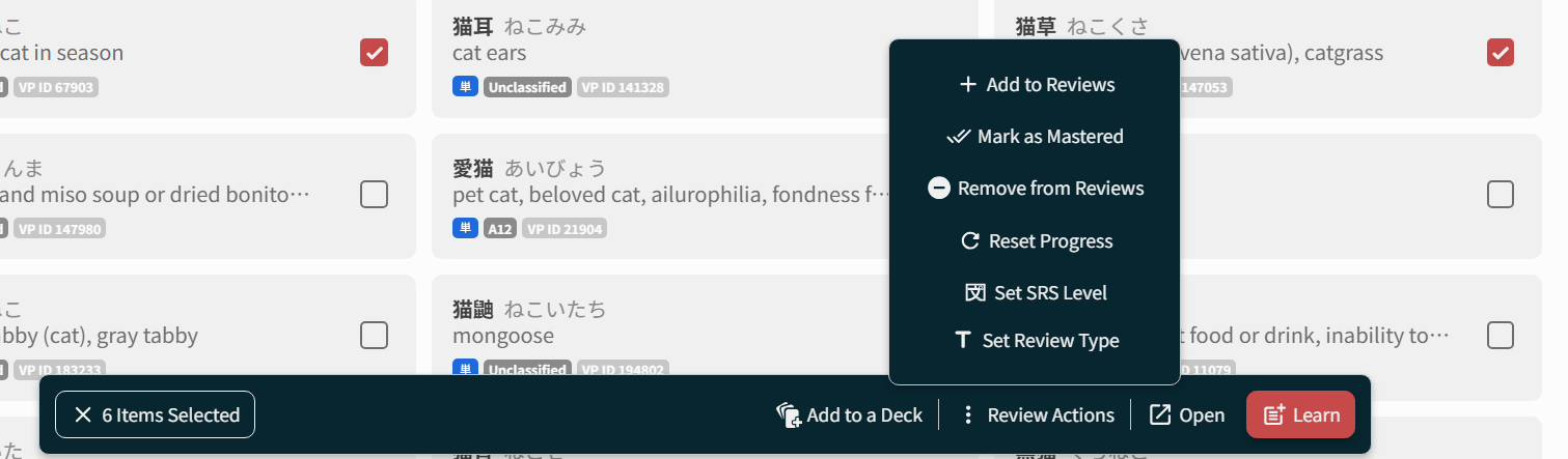 for a start, i wonder if there is a way for me to just go thru all the N5 and N4 vocab and (easily) mark off the words i know, and then cram the rest? i tried cramming the N5 vocab but there’s a lot i already know so it’s very slow going; the cram tool seems to want to present all 1100 words all at once.