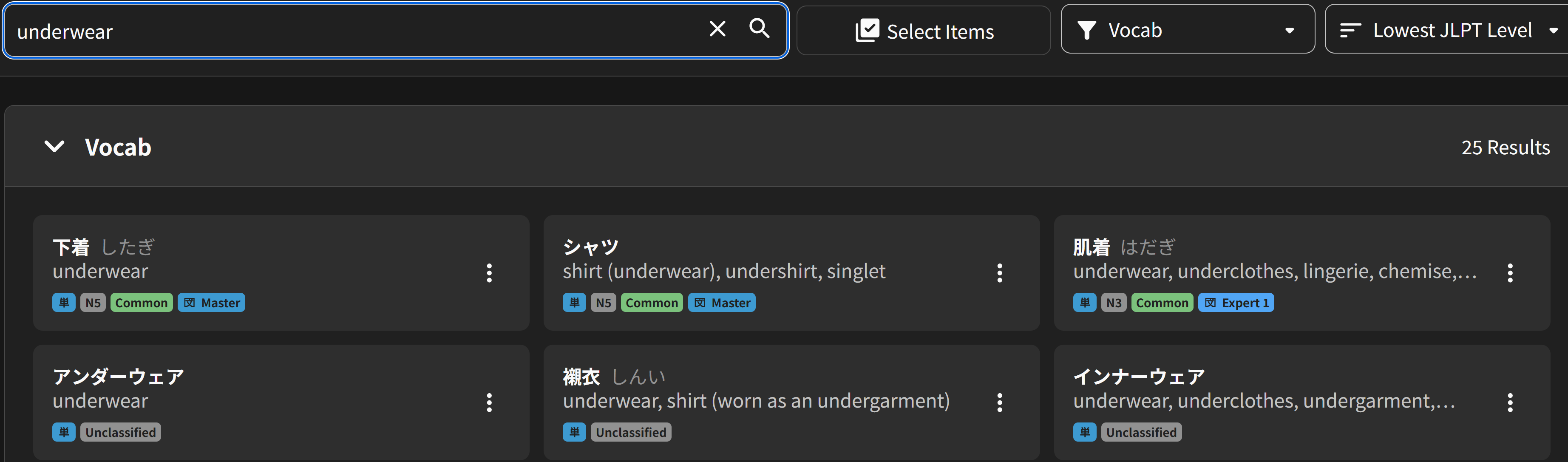 This seems to have a sample sentence about wearing underwear. That tells me that this word is used in that way. What about 肌着?