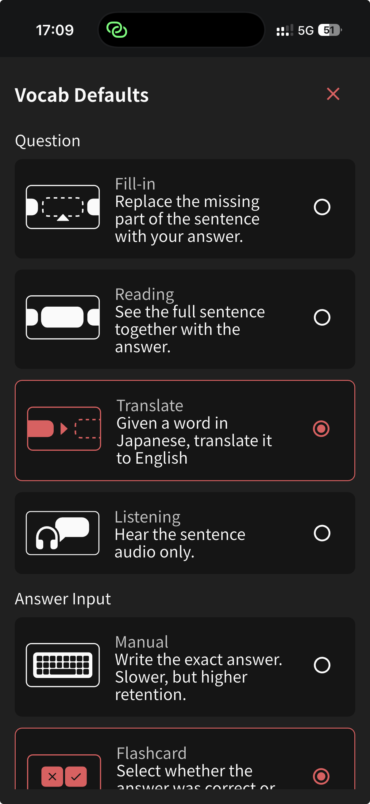 @Sean is this feature already available? I can’t find it in settings. I’m also looking for a way to have both fill in and translate reviews for the vocab at the same time (or alternating as with the feature you mentioned).