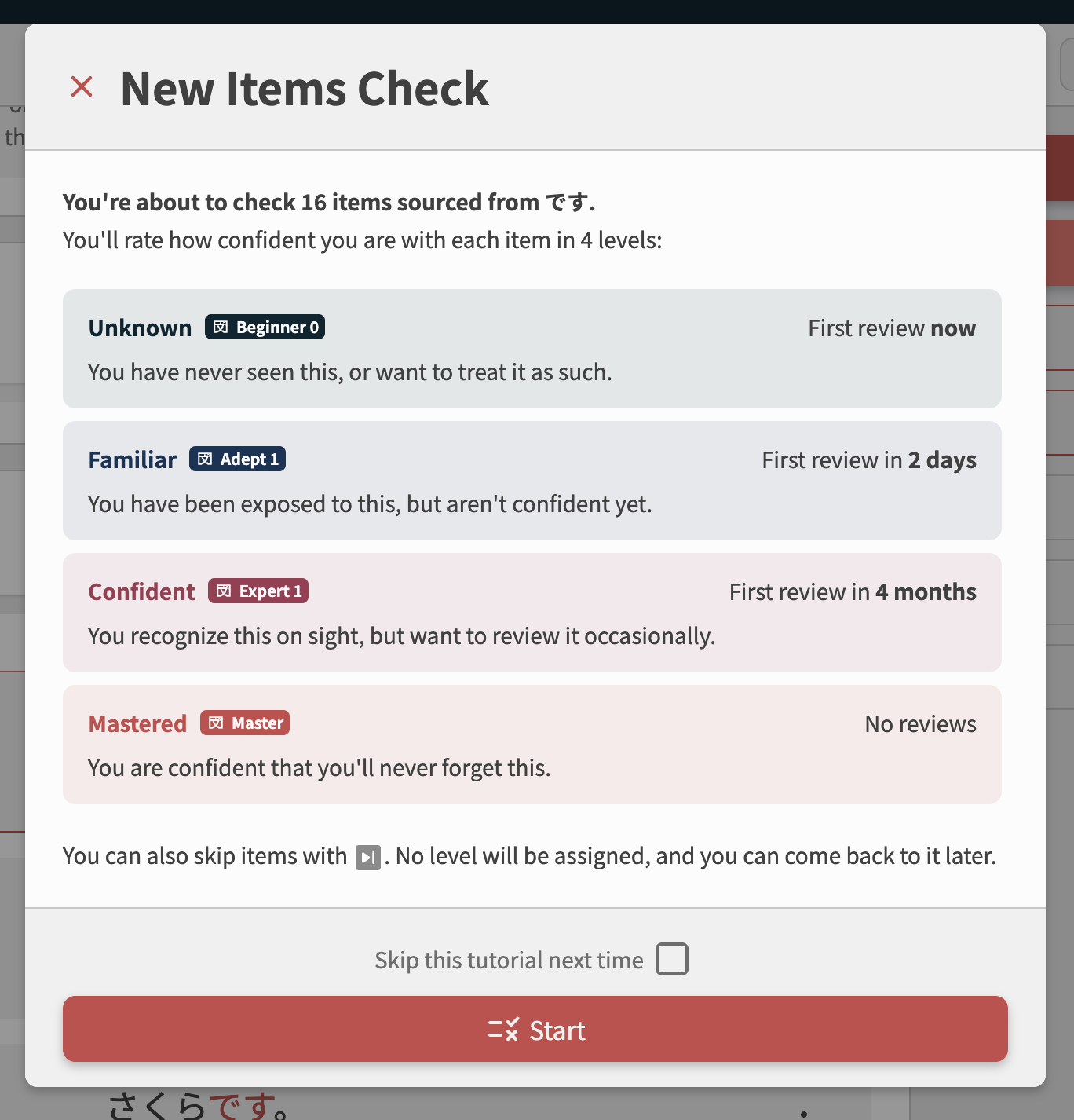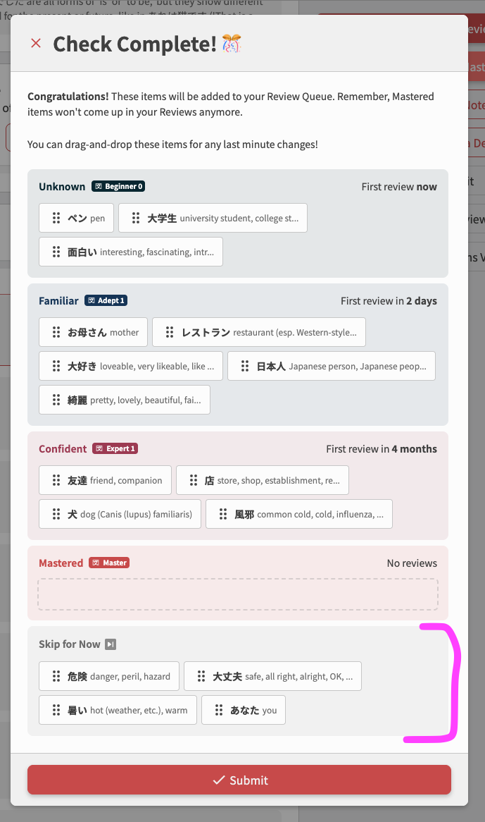 This is really cool, I like the mini quiz for checking all the unknown vocabulary. But I also want to add one vote to adding a “skip” button or something, since I don’t really want to flood my vocab reviews with obscure terms that didn’t even make the N1 or any of A decks. (or sometimes it also finds terms which are kind of duplicates of words I’m already studying from one of the official decks)