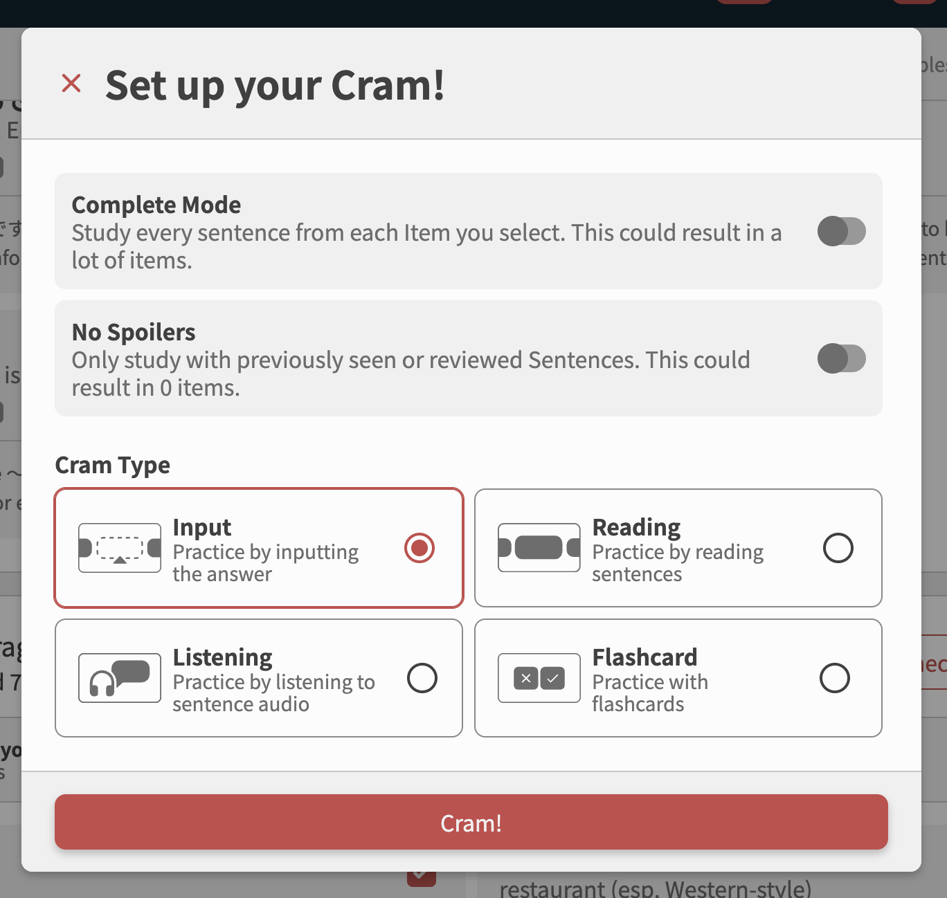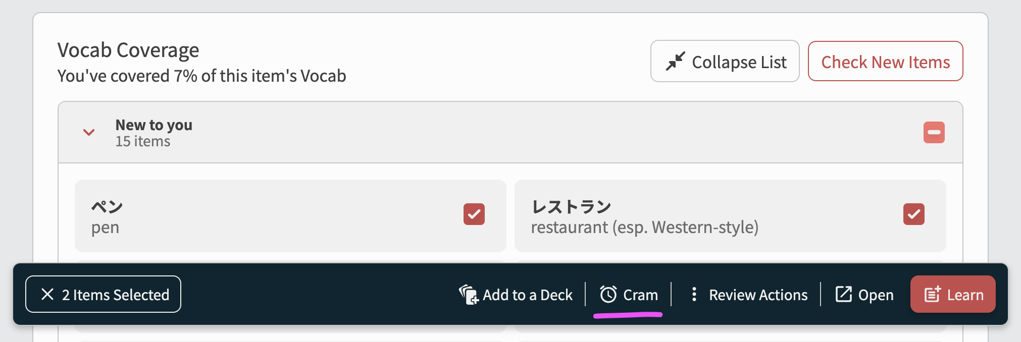 I like the idea, can we have a quick cram option like the Grammar section above? I’d rather train these words without having them added on my review schedule afterwards.